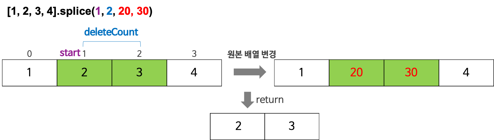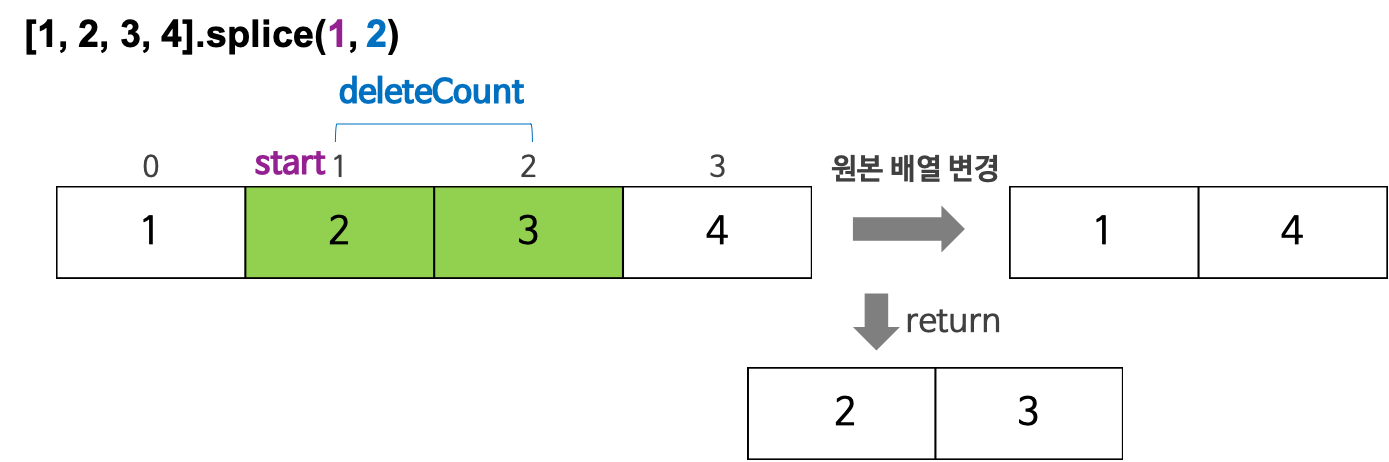 start배열에서의 시작 위치이다. start 만을 지정하면 배열의 start부터 모든 요소를 제거한다.deleteCount시작 위치(start)부터 제거할 요소의 수이다. deleteCount가 0인 경우, 아무런 요소도 제거되지 않는다. (옵션)items삭제한 위치에 추가될 요소들이다. 만약 아무런 요소도 지정하지 않을 경우, 삭제만 한다. (옵션)