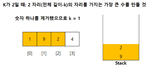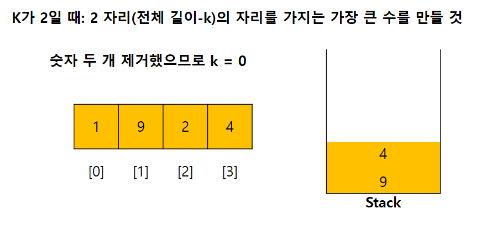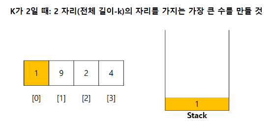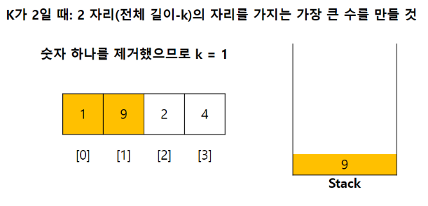 주어지는 number의 첫 자리부터 시작하여 비어있는 stack에 하나씩 psuh해준다. push를 하기 전 저장된 stack의 top의 값과 비교한다. 이 때 top보다 현재 자리의 숫자가 크다면 해당 top을 pop해준다. 이렇게 pop된 숫자는 제거가 된 숫자이다. 그렇기에 제거가 될 때 k를 -1 해준다.