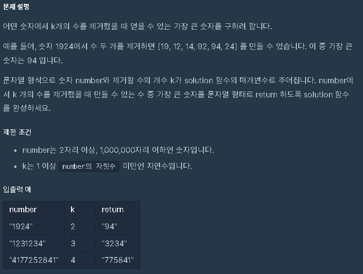 해당 문제는 탐욕범을 사용하여 풀 수 있다. 숫자를 제거하며 높은 자리 부터 탐욕적으로 채워나가면 된다.