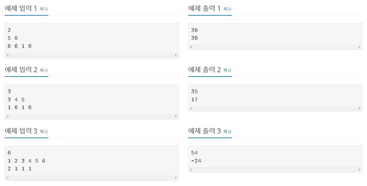 첫째 줄에 수의 개수 N(2 ≤ N ≤ 11)가 주어진다. 둘째 줄에는 A1, A2, ..., AN이 주어진다. (1 ≤ Ai ≤ 100) 셋째 줄에는 합이 N-1인 4개의 정수가 주어지는데, 차례대로 덧셈(+)의 개수, 뺄셈(-)의 개수, 곱셈(×)의 개수, 나눗셈(÷)의 개수이다.