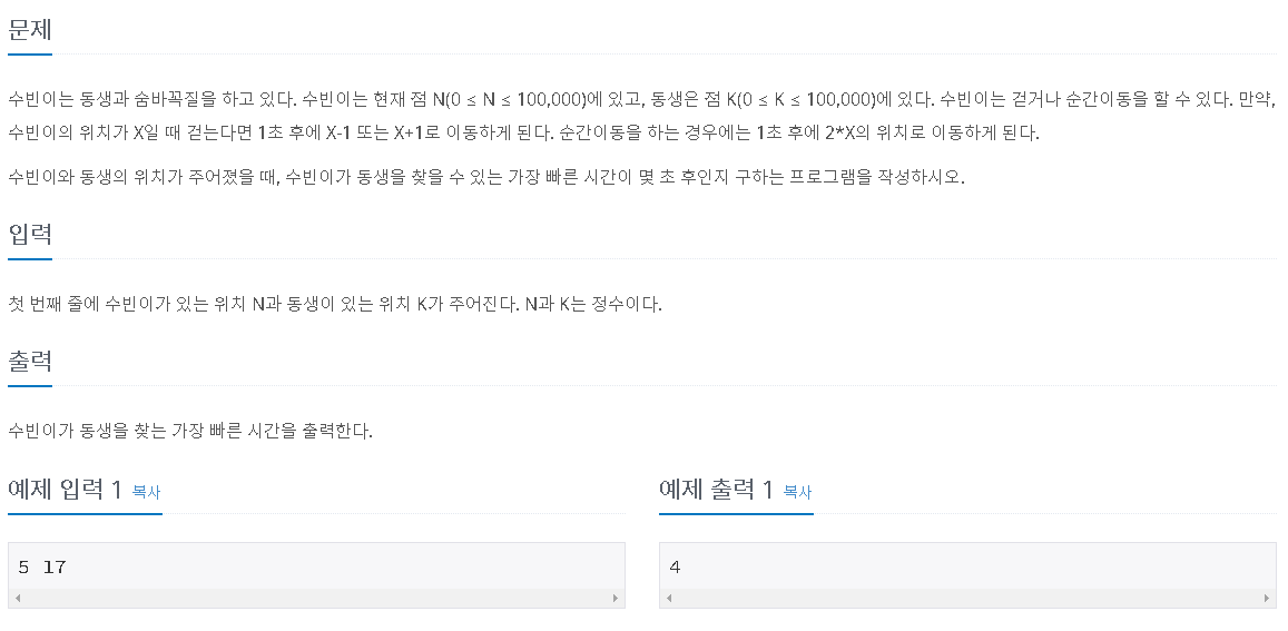 수빈이는 동생과 숨바꼭질을 하고 있다. 수빈이는 현재 점 N(0 ≤ N ≤ 100,000)에 있고, 동생은 점 K(0 ≤ K ≤ 100,000)에 있다. 수빈이는 걷거나 순간이동을 할 수 있다. 만약, 수빈이의 위치가 X일
