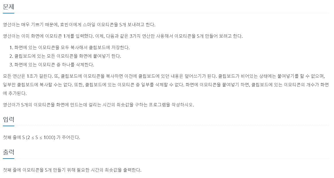 해당 문제는 3가지 진행 방식으로 진행하여 원하는 개수의 이모티콘을 만드는 최소의 방법을 구하는 문제이다. 최소의 방법을 구하기 위해 BFS를 사용하였다.