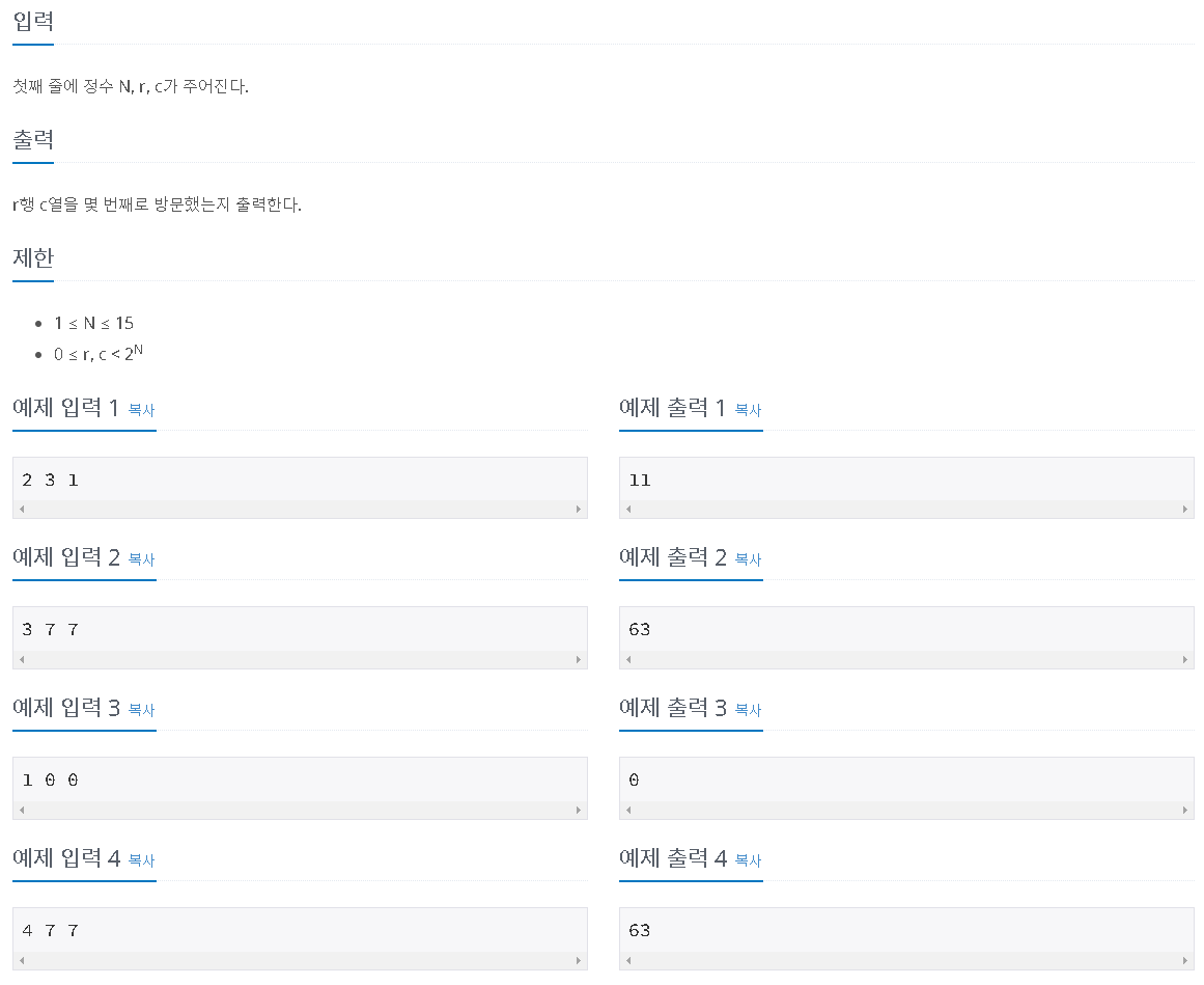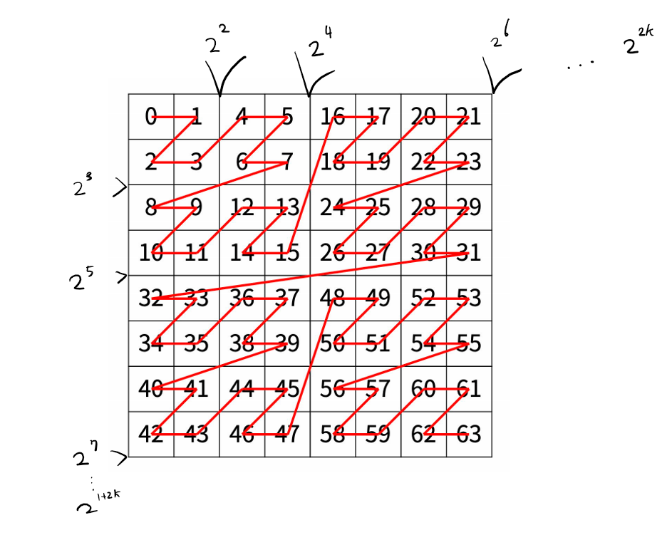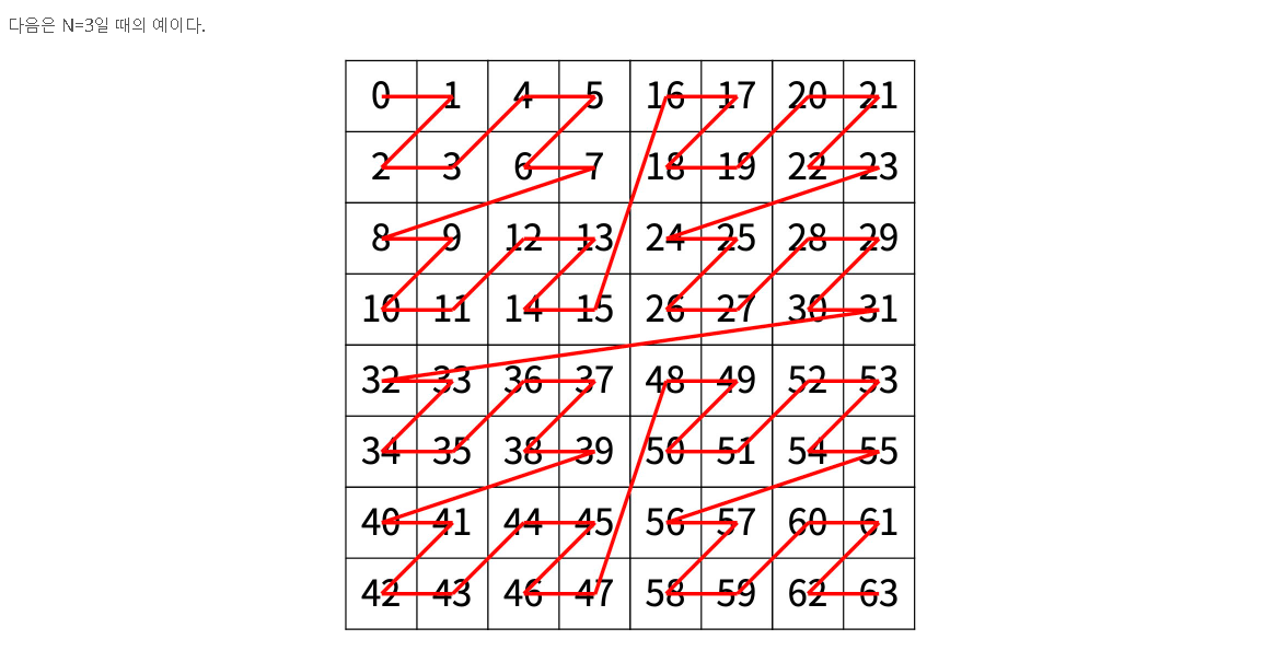 Z모양의 크기는 2^2k만큼 증가하는데 이를 x축과 y축 별로 증가하는지 작성해보았다. 각 x축은 2^2x, y축은 2^(1+2y)만큼 씩 증가한다. 그렇기에 시작점을 수학적으로 옮기며 해당 위치의 순서를 알 수 있다. 식과 그림만으로는 이해가 힘든 것 같다.