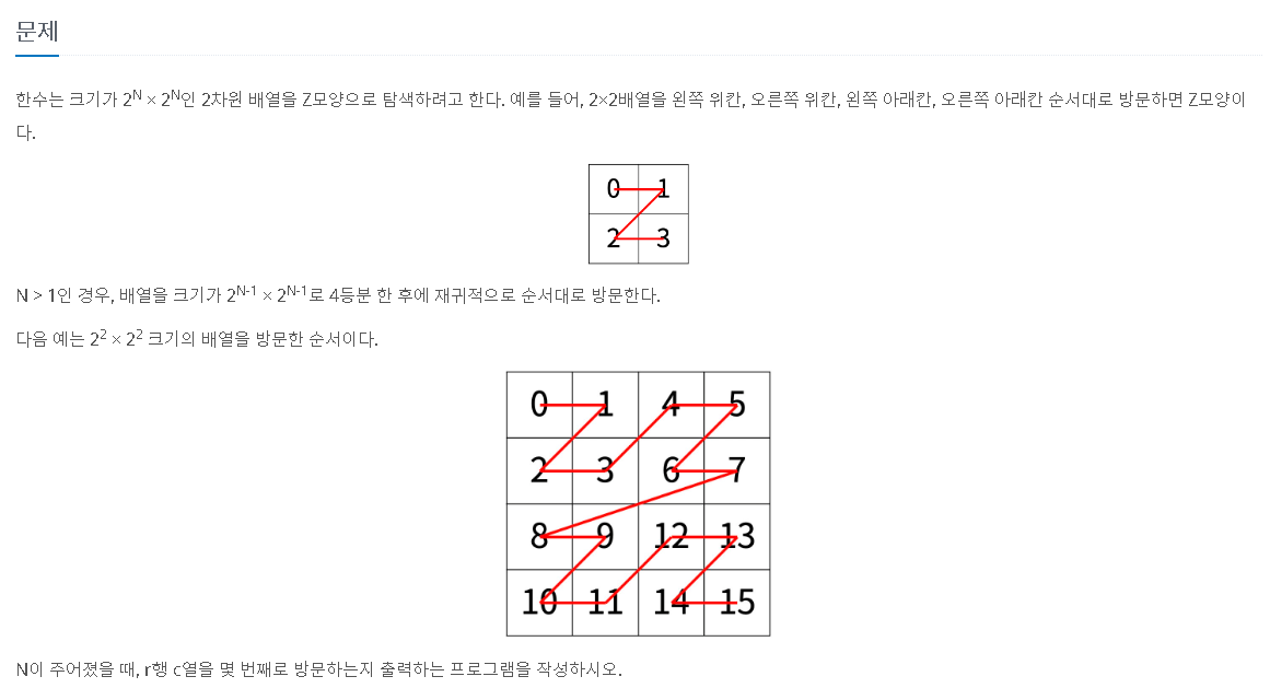 한수는 크기가 2N × 2N인 2차원 배열을 Z모양으로 탐색하려고 한다. 예를 들어, 2×2배열을 왼쪽 위칸, 오른쪽 위칸, 왼쪽 아래칸, 오른쪽 아래칸 순서대로 방문하면 Z모양이다. N > 1인 경우, 배열을