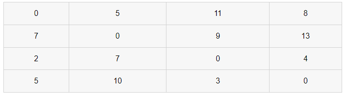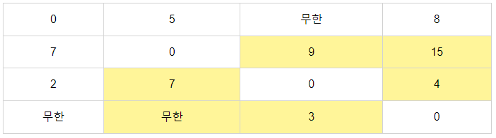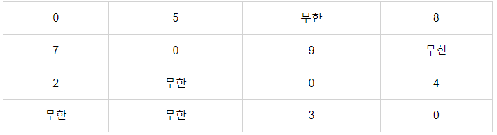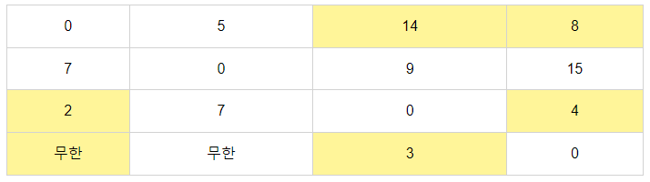 위 와 같은 그래프가 존재한다고 가정하자.이 때 각 정점에서 다른 정점으로 가는 비용을 이차원 배열로 정리하면 아래와 같다.