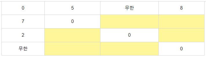 노란 부분이 노드 1을 거쳐 도착할 수 있는 부분이다. 해당 부분을 '현재까지의 최단 거리'와 '노드 1까지의 거리 + 노드 1에서 해당 부분으로 가는 거리'를 비교하여 작은 거리를 입력하면 해당 노드로 가는 현재까지의 최단 거리를 새로 구할 수 있다.