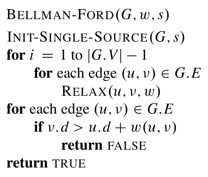 따라서 그래프 모든 엣지에 대해 edge relaxation을 시작노드를 제외한 전체 노드수 만큼 반복 수행한 뒤, 마지막으로 그래프 모든 엣지에 대해 edge relaxation을 1번 수행해 줍니다. 이때 한번이라도 업데이트가 일어난다면 위와 같은 negative cycle이 존재한다는 뜻이 되어서 결과를 구할 수 없다는 의미의 false를 반환하고 함수를 종료하게 됩니다. 벨만-포드 알고리즘 전체의 의사코드는 다음과 같습니다.