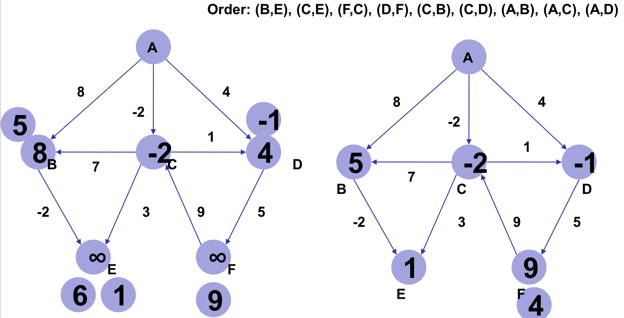 상단 좌측 그림 차례입니다. (B,E)의 경우 8-2=6이고 이는 기존 거리(무한대)보다 작으므로 6을 E에 기록해 둡니다. (C,E)의 경우 -2+3=1이고 이는 기존 거리(6)보다 작으므로 1을 E에 기록해 둡니다. (F,C)의 경우 무한대+9=무한대이므로 업데이트할 필요가 없습니다. (D,F)의 경우 4+5=9이고 이는 기존 거리(무한대)보다 작으므로 9를 F에 기록해 둡니다. (C,B)의 경우 -2+7=5이고 이는 기존 거리(8)보다 작으므로 5를 B에 기록해 둡니다. (C,D)의 경우 -2+1=-1이고 이는 기존 거리(4)보다 작으므로 -1을 D에 기록해 둡니다.
