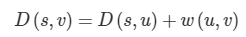 최단경로 문제의 optimal substructure를 확장하면 최단경로를 다음과 같이 분해(decompostion)할 수 있습니다. 시작노드 s에서 v에 이르는 최단경로는 s에서 u까지의 최단경로에 u에서 v 사이의 가중치(거리)를 더한 값이라는 겁니다.