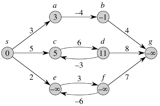 위 그림에서 c,d 그리고 e,f가 사이클을 이루고 있는 걸 확인할 수 있습니다. c,d의 경우 사이클을 돌 수록 거리가 커져서 최단경로를 구할 때 문제가 되지 않습니다. 반면 e,f의 경우 사이클을 돌면 돌수록 그 거리가 작아져 벨만-포드 알고리즘으로 최단경로를 구하는 것 자체가 의미가 없어집니다.