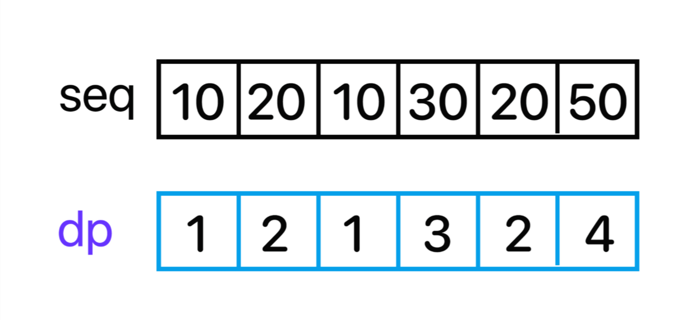 위 예제의 수열은 {10, 20, 10, 30, 20, 50} 이다. 이를 seq라고 하고, dp[] 배열에 메모이제이션을 한다.