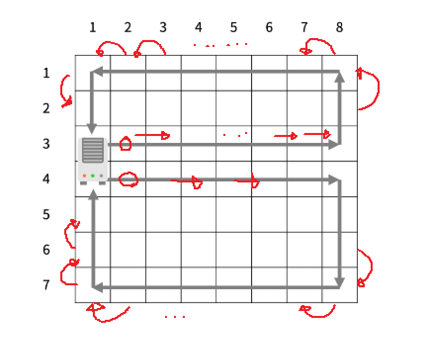 다음으로는 공기 순환을 구현하였다. 이는 입력 받은 공기청정기를 기준으로 시계 / 반시계 방향으로 순환하는데, 이 때 반복문을 이용하면 간단하게 구현할 수 있다.