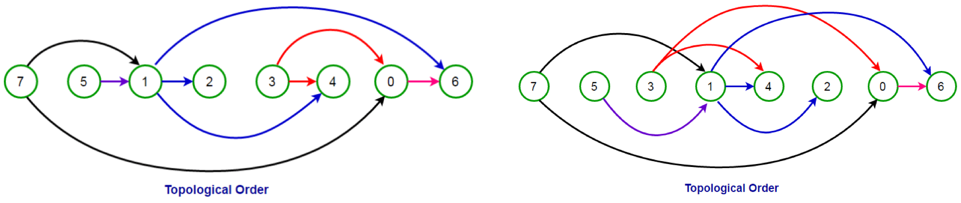- 위상 정렬의 과정에서 선택되는 정점의 순서를 위상 순서(Topological Order)라 한다.
